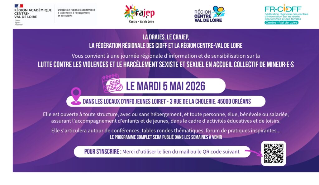 Le CRAJEP coordonne avec la DRAJES, la Fédération Régionale des CIDFF, et la Région Centre Val de Loire, une journée inspirante sur la lutte contre les Violences et le Harcèlement Sexiste et Sexuel en Accueil Collectif de Mineur·e·s.